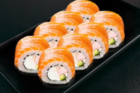 Рис, нори, сливочный сыр, лосось, огурец, креветки.