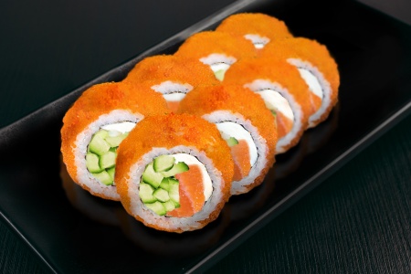 Рис, нори, тобико, огурец, лосось, сливочный сыр.